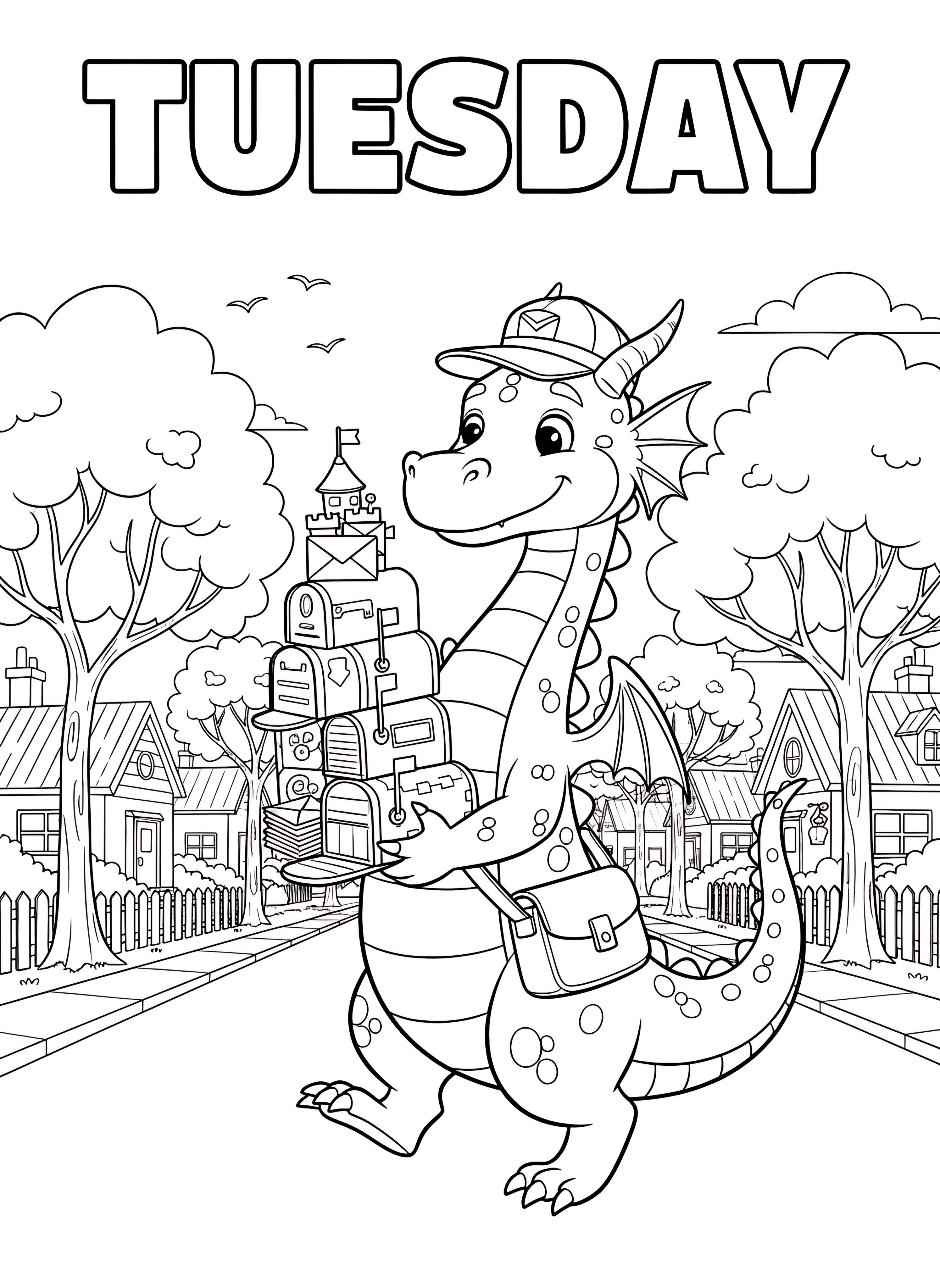Welcome to our special collection of 11 unique coloring pages designed specifically for Tuesday fun! From friendly dragons delivering mail to busy beavers building dams, there's an exciting scene awaiting your creative touch. Download these delightful Tuesday-themed prints instantly for free!